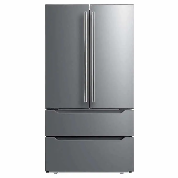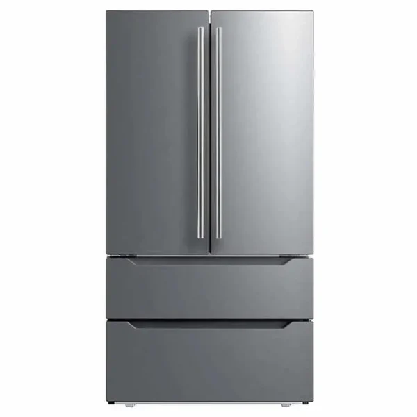 The Midea MRQ23BCAST is a sleek 36-inch wide, counter-depth French door refrigerator offering 22.5 cu.ft. total capacity — ideal for modern kitchens that want both style and function. It features four doors: the top two for fresh food and two pull-out drawers for the freezer section. This model comes as brand new and does not include a water dispenser, making it great for settings where a dispenser is not required. Midea+1